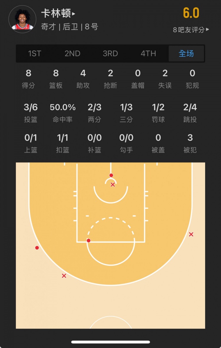 菜鸟丨卡斯尔22中9全场22分7板5助3断 次轮“状元”16分6板2断2帽
