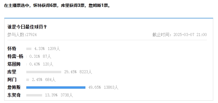 在主播票选中,怀特获得6票,库里获得3票,詹姆斯1票。