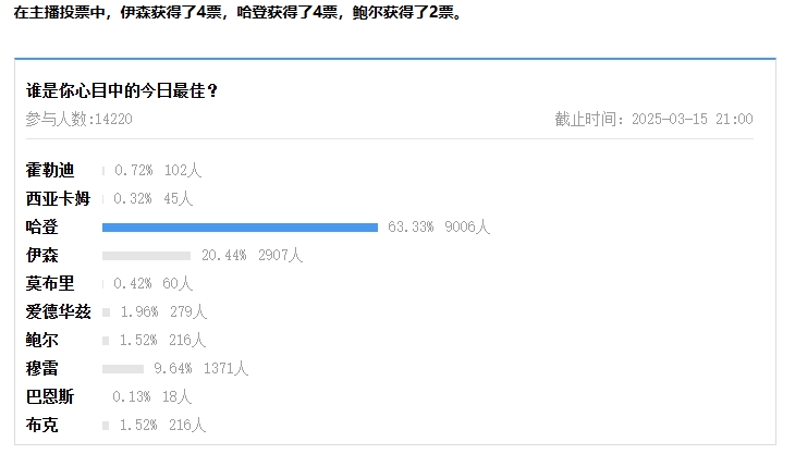 在主播投票中,伊森获得了4票,哈登获得了4票,鲍尔获得了2票。