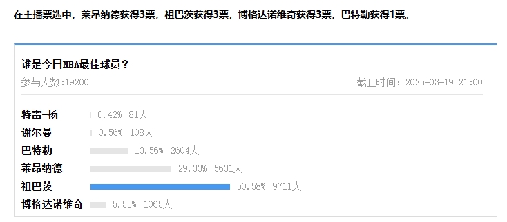 在主播票选中,莱昂纳德获得3票,祖巴茨获得3票,博格达诺维奇获得3票,巴特勒获得1票。