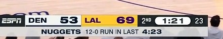 半场掘金失误14次&湖人10次 利用失误得分湖人23-16掘金