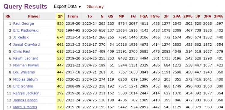 根据数据统计,加上已经投进的1个三分,鲍威尔快船生涯三分数来到448记,他超越路威,独居队史三分榜第7位。