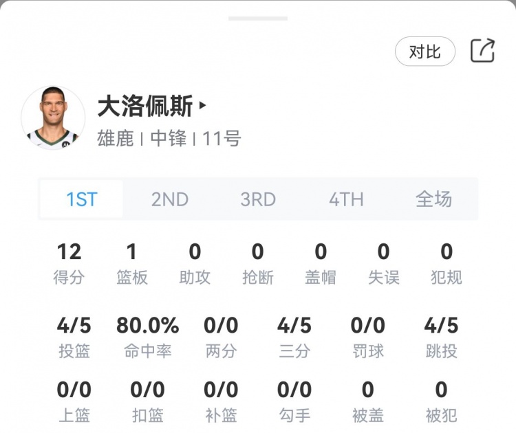 第一节,雄鹿中锋大洛佩斯手感火热,半节的时间三分5投4中独得12分,帮助球队占据主动。