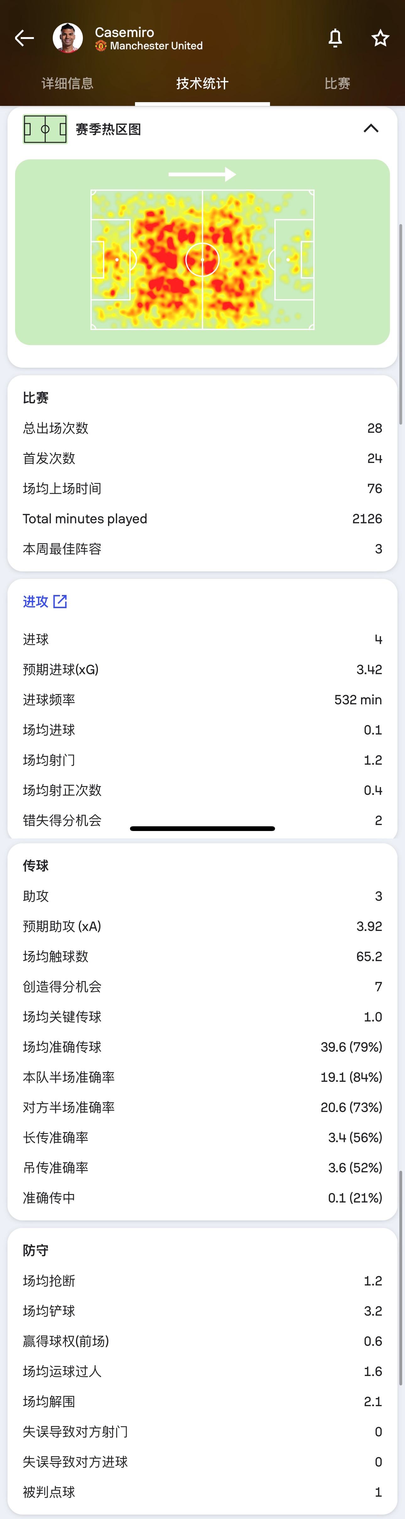 卡塞米罗表示:“回顾我的职业生涯,就我个人而言,我作为职业足球运动员最好的赛季是在曼联的第一个赛季。”