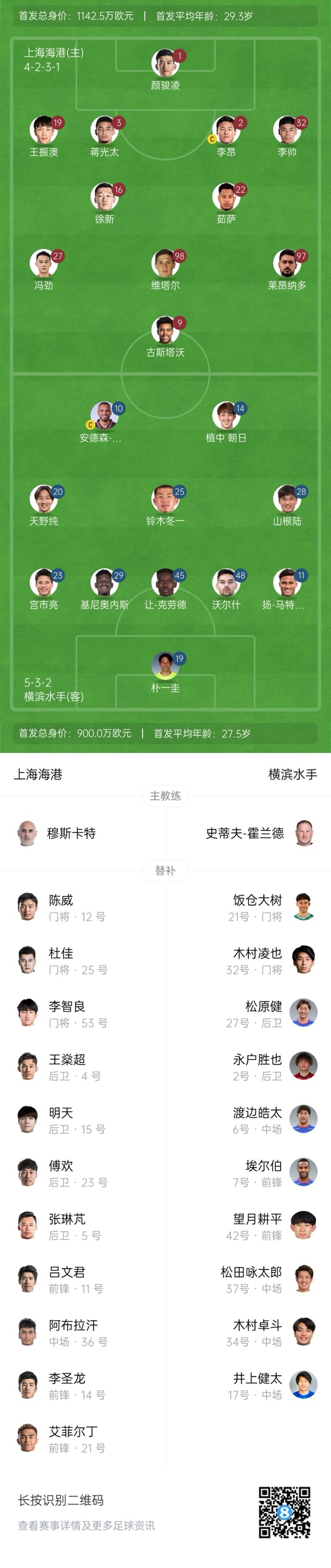 上海海港首发:1-颜骏凌、2-李昂、3-蒋光太、19-王振澳、32-李帅、16-徐新、22-茹萨(F)、98-马特乌斯-维塔尔(F)、9-古斯塔沃(F)、27-冯劲、97-莱昂纳多(F)