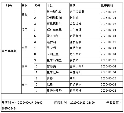 传足胜负彩第25028期竞猜赛事涵盖五大联赛,其中英超曼城VS利物浦是全欧关注的焦点,此外拜仁、尤文和皇马等豪门也将陆续出战。