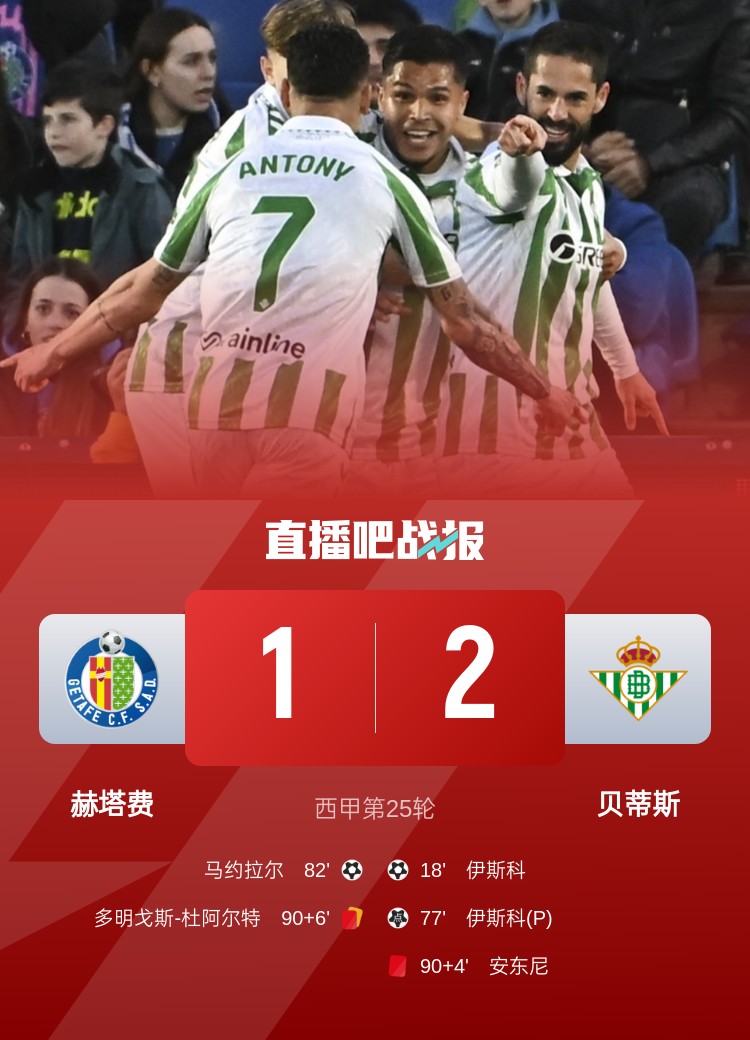 西甲第25轮,贝蒂斯2-1击败赫塔费。上半场,安东尼长途奔袭连续过人助攻伊斯科破门;下半场,安东尼错失良机,库乔造点,伊斯科点射完成双响,马约拉尔扳回一球,补时安东尼背后铲人被直红罚下,多明戈斯-杜阿尔特2黄变1红也被罚下。