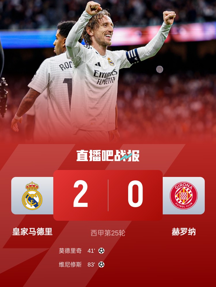 近4轮首胜!皇马2-0赫罗纳追平榜首 莫德里奇世界波维尼修斯破门