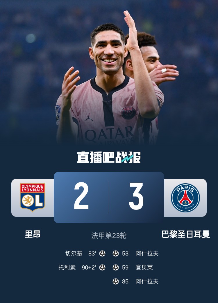 法甲第23轮,巴黎圣日耳曼3-2里昂。上半场,阿什拉夫犯规染黄,双方互交白卷;下半场,阿什拉夫打入两球上演梅开二度,登贝莱破门打入个人联赛第17球,切尔基和托利索为里昂扳回两球。