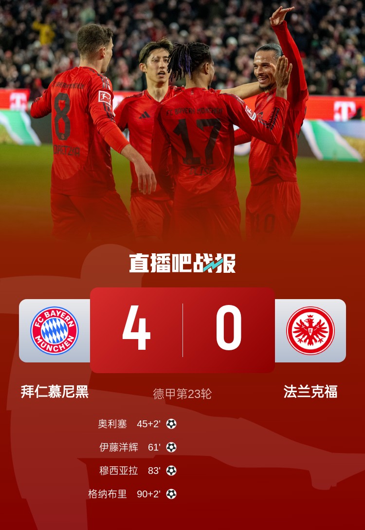 德甲第23轮,拜仁4-0法兰克福。上半场,基米希伤退,奥利塞破门;下半场,伊藤洋辉打进自己的拜仁生涯首球,穆西亚拉一条龙,格纳布里锦上添花。
