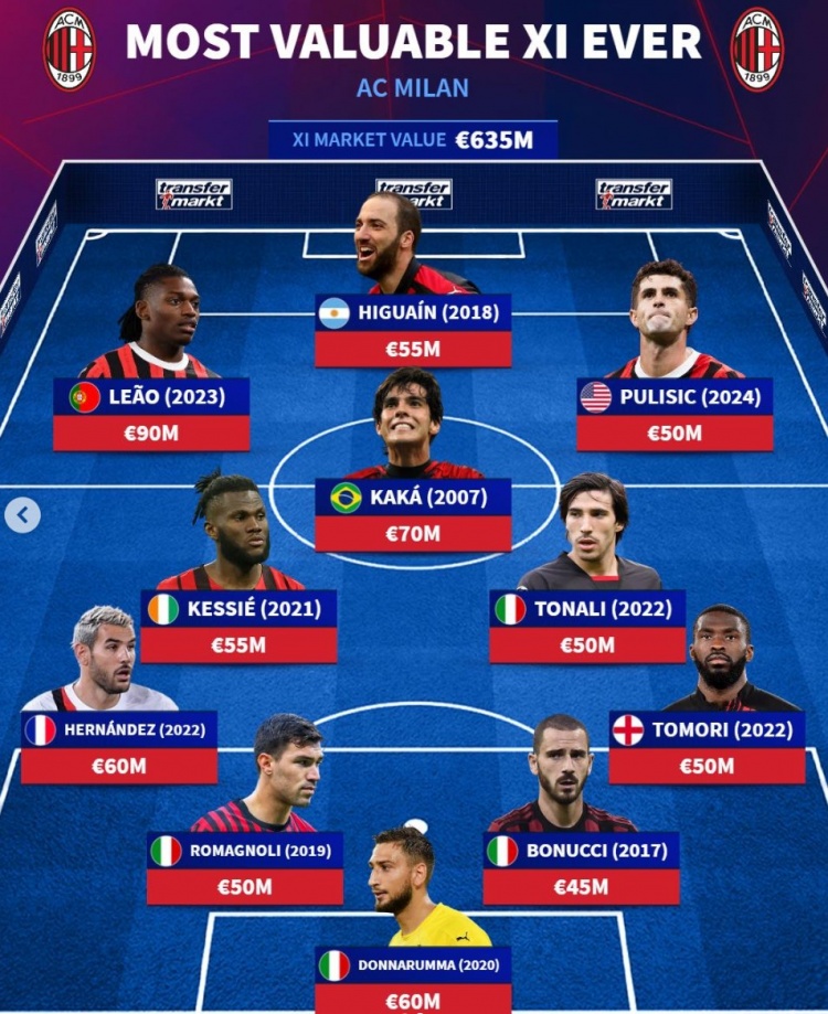 米兰历史最贵阵:总身价6.35亿欧元