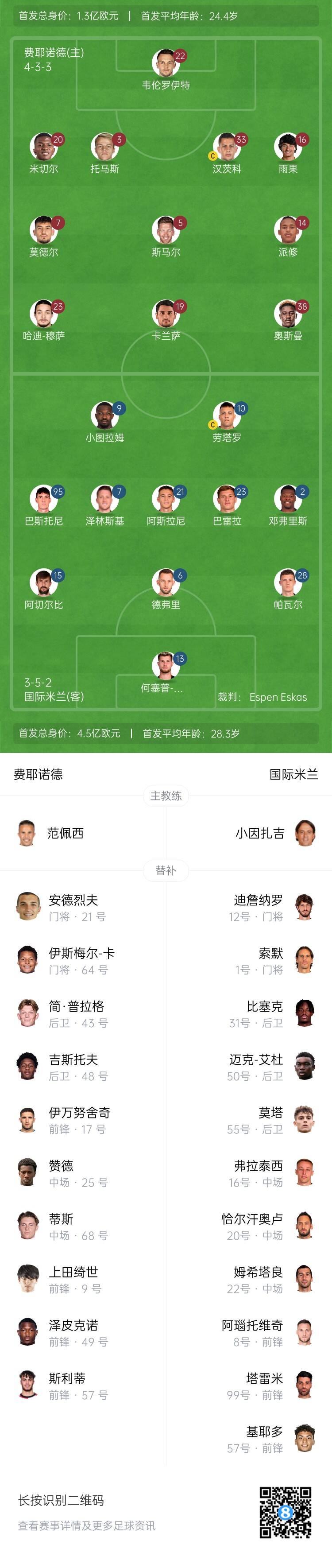 国米vs费耶诺德首发:劳塔罗、小图拉姆、阿斯拉尼出战