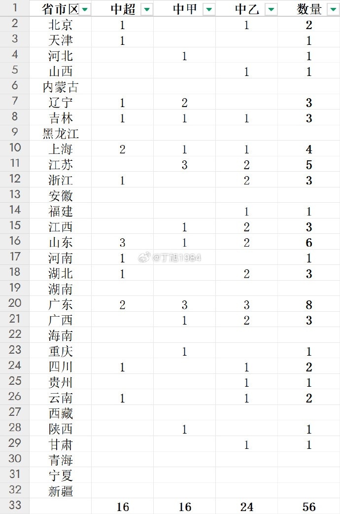 三级职业联赛球队分布:广东省8队最多,山东省6队第二江苏省第三