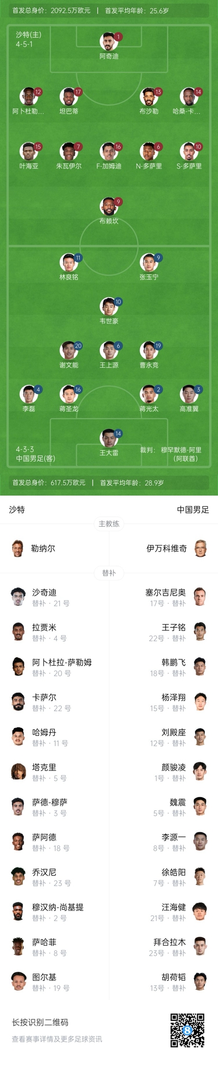 沙特替补:21-哈米德-尚基提、22-艾哈迈德-卡萨尔、2-穆汉纳-尚基提、3-萨阿德-穆萨、4-阿里-拉贾米、5-吉哈德-萨克里、23-齐亚德-乔汉尼、8-马尔万-萨哈菲、11-阿卜杜拉-哈姆丹、18-穆哈纳德-萨阿德、19-图尔基-阿马尔、20-阿卜杜拉-萨利姆