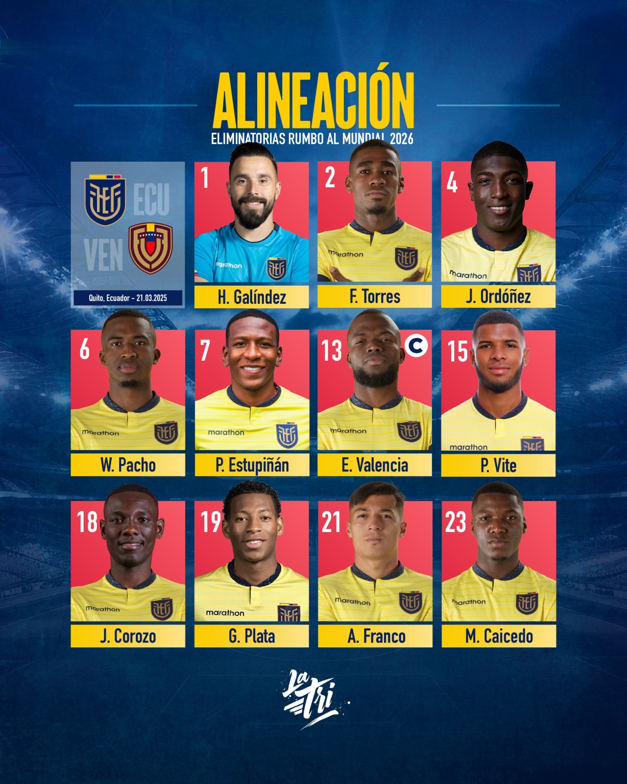厄瓜多尔首发:1-加林德斯、2-F-托雷斯、4-奥多涅兹、6-帕乔、7-埃斯图皮尼安、15-佩德罗-维特、23-凯塞多、19-普拉塔、21-A-弗兰科、18-科罗佐、13-瓦伦西亚