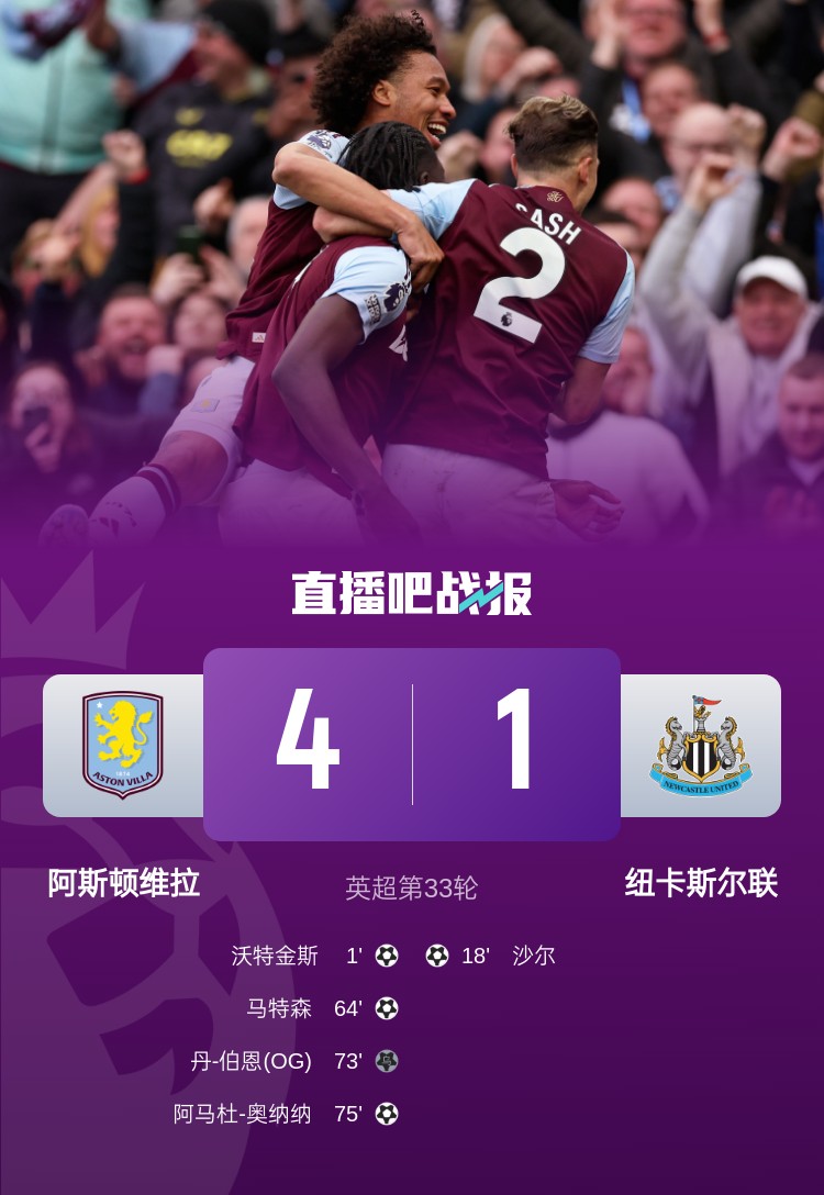 英超联赛第33轮,阿斯顿维拉4-1大胜纽卡斯尔联,沃特金斯传射,马特森进球。