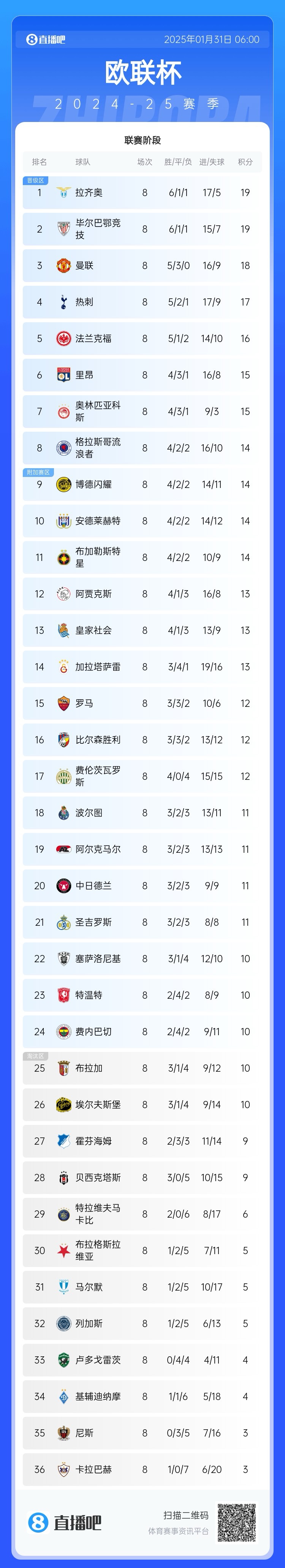 欧联最终积分榜:蓝鹰曼联热刺直通,费内巴切第24极限进附加赛 1月31日讯 欧联杯联赛阶段收官,最新积分榜情况出炉!拉齐奥与毕巴以19分排名前二,曼联8场不败第3,热刺第4,罗马第14名进附加赛。费内巴切本轮2-2中日德兰,以1个净胜球的优势极限力压布拉加,拿到 2025/01/31